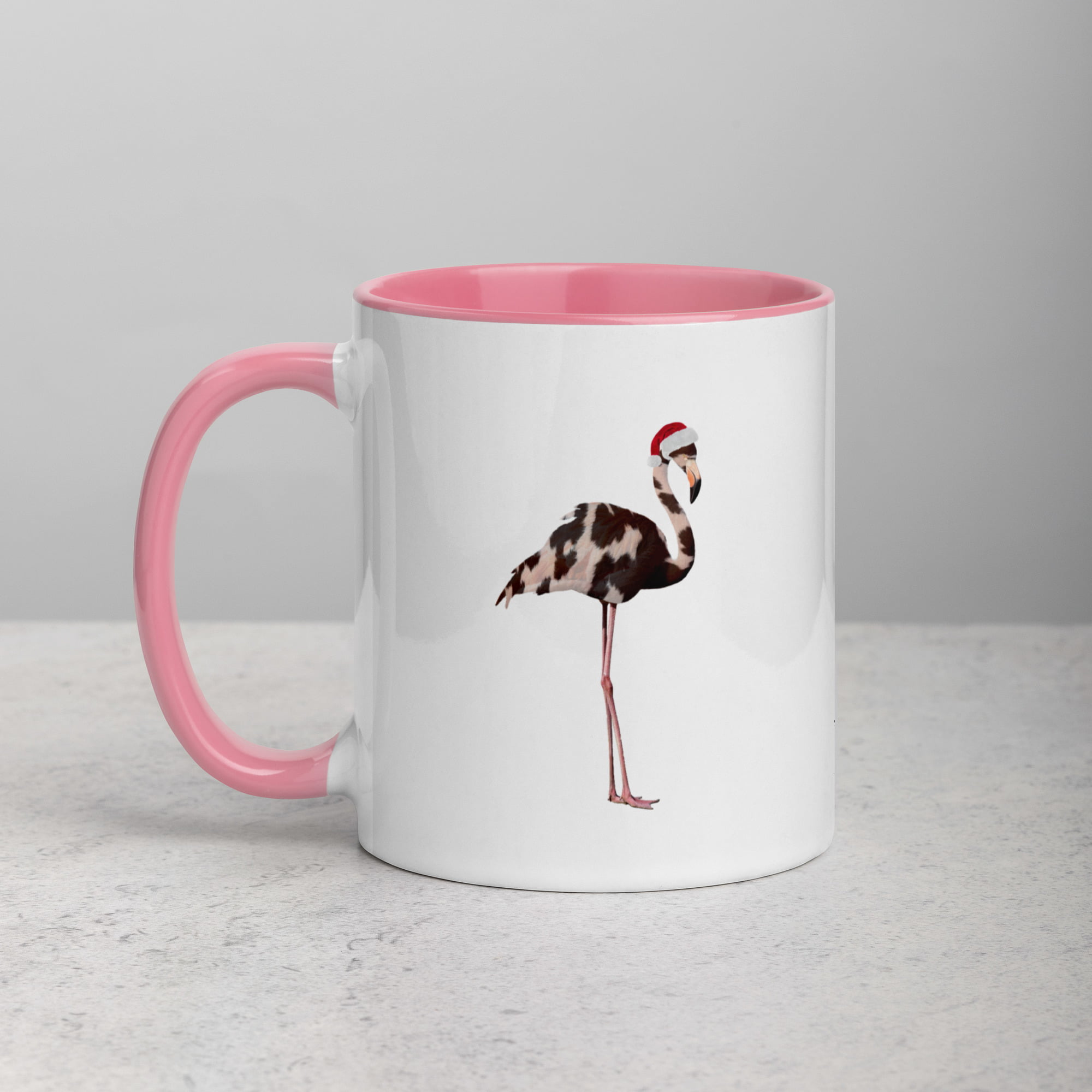 A playful and quirky mug with colourful accents featuring a cow printed flamingo wearing a santa hat.